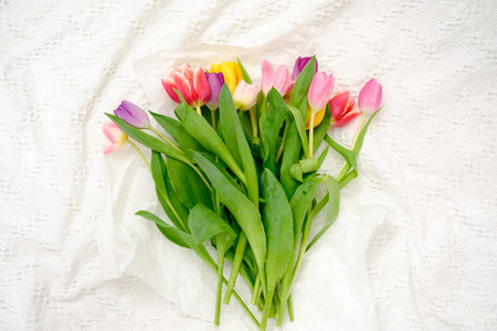 An exquisite and beautiful arrangement of an array of vibrant tulips placed on a soft white texture surface