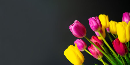 Fresh tulips bouquet lying on a dark grey stone surface, copy space for a text