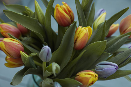 Beautiful yellow purple tulips on a light background. Fresh spring flowers. Copy space for text. Top view floral summer concept. Banner.