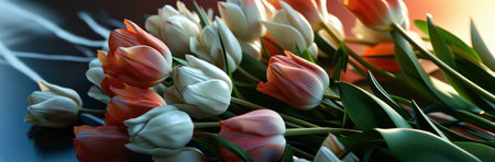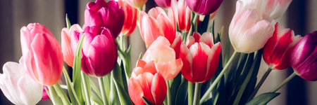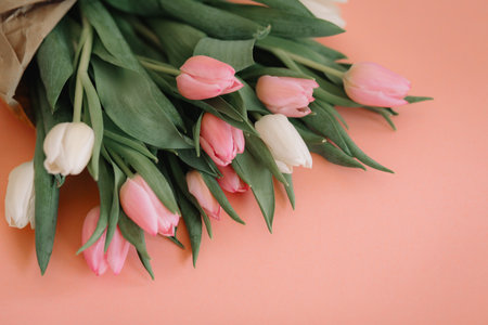 Banner with bouquet of tulips in pink and white colors. Concept of spring, Women's Day, Mother's Day, 8 March, the holiday greetings