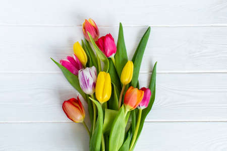 Colorful bouquet of tulips on white wooden background. Spring flowers. Greeting card with copy space for Valentine's Day, Woman's Day and Mother's Day. Top view.