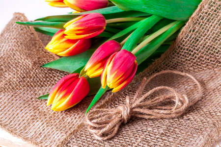 Red-white tulips on wooden boards. A bouquet of tulips on a tree. Beautiful tulips on wooden boards. Bouquet of tulips collected in a ribbon. Composition of flowers collected by ribbon