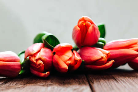 Bouquet from red fresh tulips on light oak wood background. Spring holidays template. Womens day, spring, love, romantic, flowers, garden, Easter card, banner, header template
