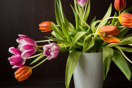 Bunch of fresh cut tulips in vase on a table with soft focus and bright light from the window