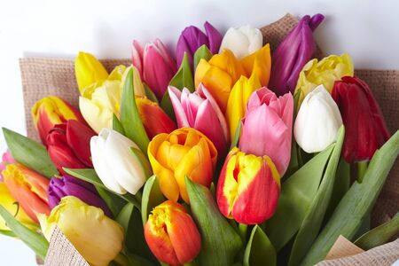 Colorful bouquet of red tulips on a white background. Holiday celebration. Colorful celebration background. Bouquet as a gift. Mother's day, international women's day, anniversary. Copy space