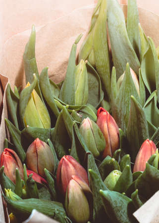 Close-up Large Beautiful bouquet of mixed tulips. Flower background and Wallpaper. Floral shop concept . Beautiful fresh cut bouquet. Flowers delivery.