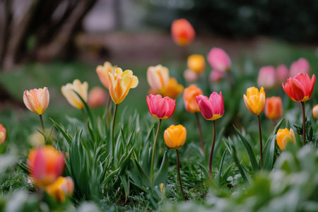 Bright tulips in shades of pink, orange, and yellow thrive in a lush garden setting. Morning light enhances their vibrant colors as nature awakens in spring.