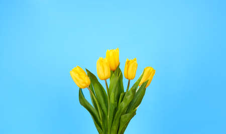 Yellow tulips on blue background. Floral bouquet of fresh flowers on light blue background.