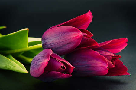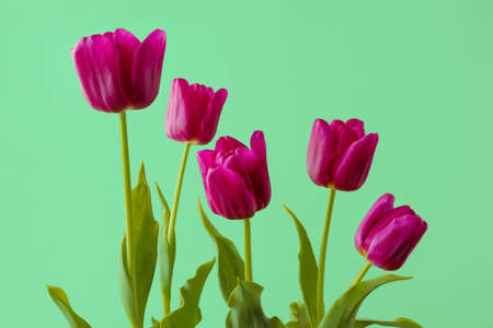 Burgundy tulips on light green background. Bunch of beautiful fresh flowers close up on green