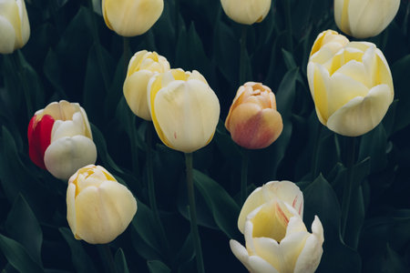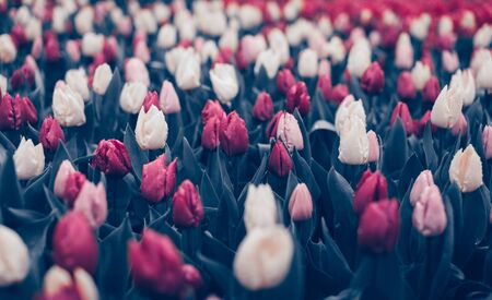 Tulips in famous Keukenhof park in Netherlands. Beautiful blooming multicolored flowers in spring garden, vibrant floral background with vintage toning for design.