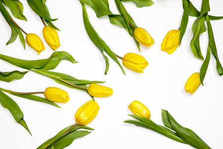 Abstract floral background. Bouquet of yellow tulips on white background. Flat lay, top view floral festive holiday concept