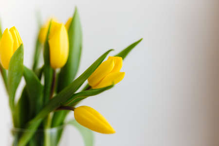 Bouquet of yellow tulip flowers in vase on gray background. Concept for greeting card for Easter, Mother's day, International women's day, Saint Valentine's day. High quality photo