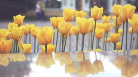 Beautiful yellow tulips bloom in the twilight of a summer's evening. The beauty of nature, the delicate petals of these flowers.
