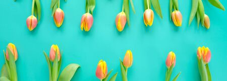Frame with fresh yellow-red tulips on a mint background. Concept of international women's day, mother's day, Easter