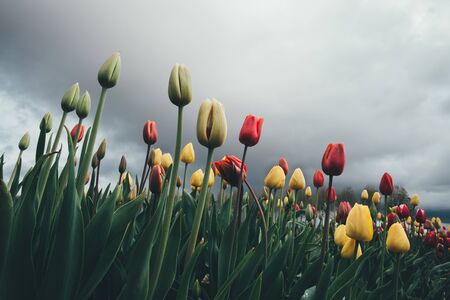 Flower bed of bright vivid red and yellow Tulips in Spring