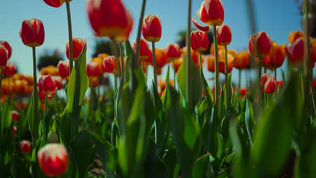 Flower field with fresh green grass and blooming tulips. Beautiful closeup tulip garden with bright green leaves and red flowers in sunny day. Spring blooming garden in blue sky background.