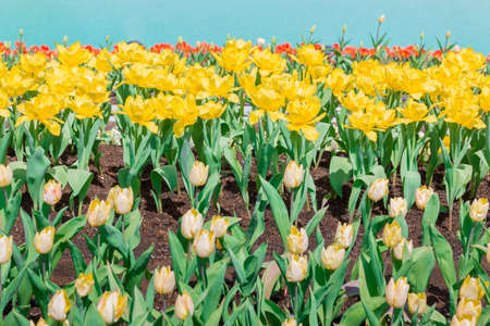 Colorful tulips grow in flower bed in the spring garden. Beautiful spring nature.