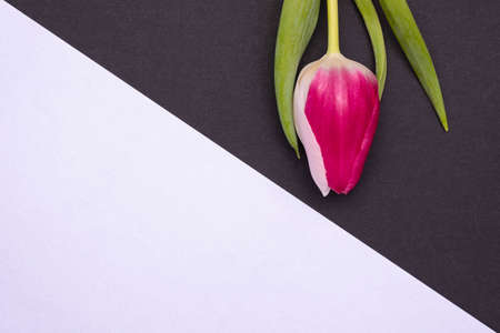 white and black background, beautiful unusual tulip with white and pink petals, close-up