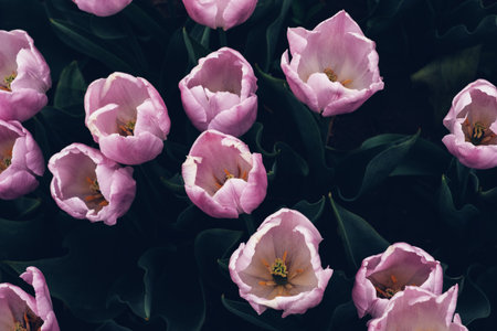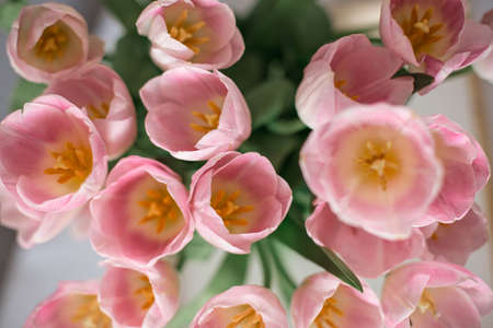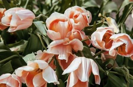 Beautiful fresh pastel colored tulip flowers in full bloom, close-up view. Natural spring floral texture for background.
