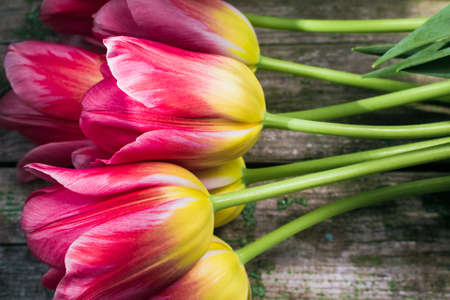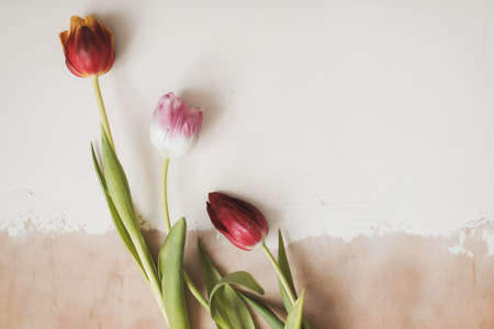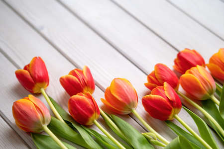 Holiday spring background. Colorful tulip flowers on white wooden backdrop. Greeting card with copy space for Valentine's Day, Woman's Day and Mother's Day.