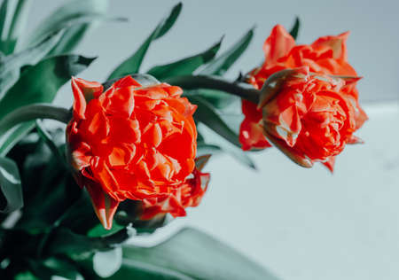Red tulips bunch on light gray background. Woman, mother, valentines day concept