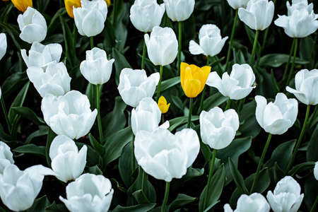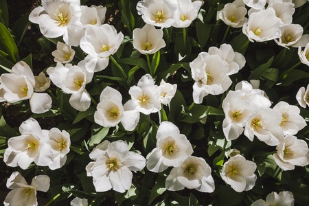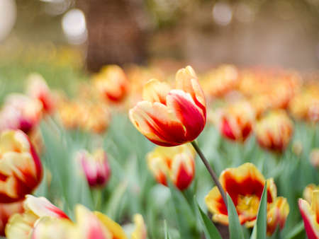 Close up of blooming flowerbeds of blossoming tulips during spring. Public flower garden, Netherlands.