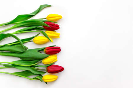 Bouquet of yellow and red tulips arranged on the left on white background with copy blank space on the right. Template for greeting cards.