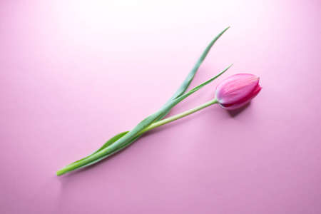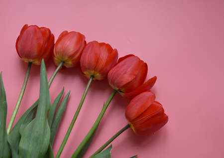 Fresh tulip flowers on a pink background. Bright spring background. Copy space for text.