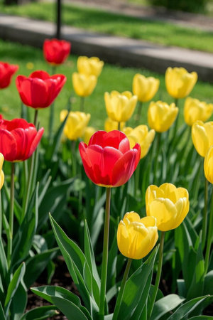 Top view of beautiful blooming red and yellow tulips, symbolizing spring and natural beauty