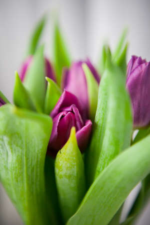Bunch of fresh cut tulips in vase on a table with soft focus and bright light from the window