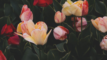 Beautiful fresh pastel colored tulip flowers in full bloom in the garden, close up view with dark green leaves background. Floral spring texture for background.