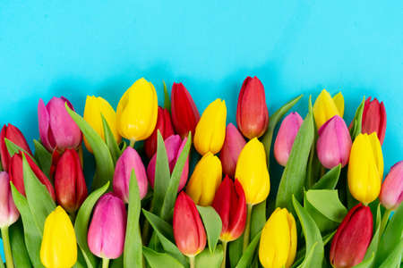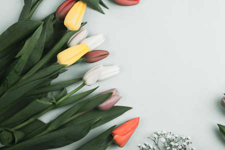 Floral background with copy space. Flat-lay frame of tulips. Womens day, mothers day greeting card
