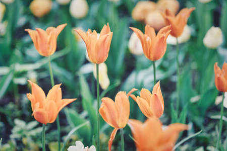 Stylish background with orange tulips and a spring flower bed, toned image wallpaper, card for mothers day.