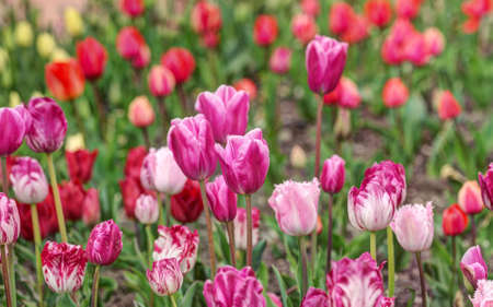 Close up of blooming flowerbeds of blossoming tulips during spring. Public flower garden, Netherlands.