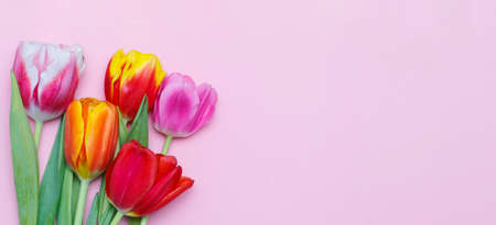 Banner with bouquet of tulips in pink and white colors. Concept of spring, Women's Day, Mother's Day, 8 March, the holiday greetings