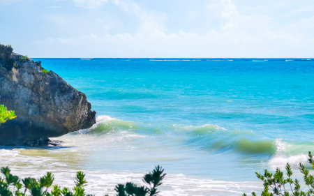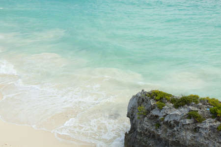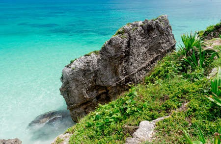 Rock at natural seascape and beach panorama view at the ancient Tulum ruins Mayan site with temple ruins pyramids and artifacts in the tropical natural jungle forest palm in Tulum Mexico.