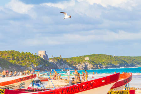 Tulum Mexico February 02, 2022 Amazing and beautiful caribbean coast and beach panorama view with turquoise water waves and boats of Tulum in Quintana Roo Mexico.