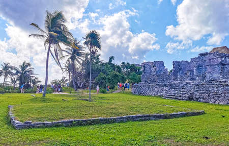 Tulum Mexico February 21, 2022 Ancient Tulum ruins Mayan site with temple ruins pyramids and artifacts in the tropical natural jungle forest palm and seascape panorama view in Tulum Mexico.