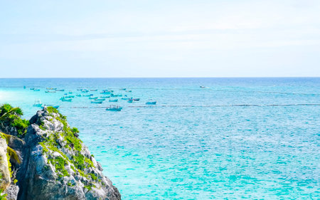 Fisherboats and tour trip boats at natural seascape and beach panorama view at the ancient Tulum ruins and Mayan site in Tulum Mexico.