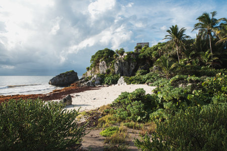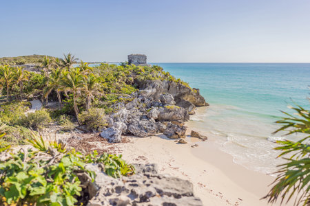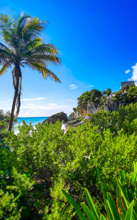 Natural seascape coast and beach panorama view at the ancient Tulum ruins Mayan site with temple ruins pyramids and artifacts in the tropical natural jungle forest palm in Tulum Mexico.