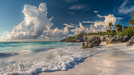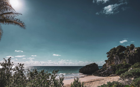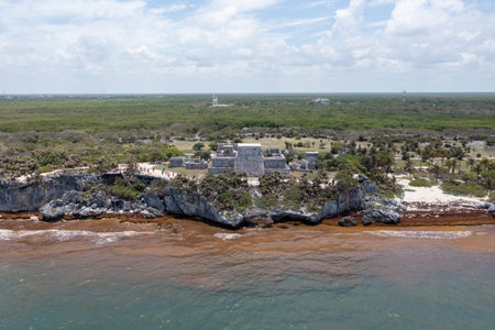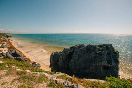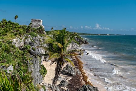 Natural seascape coast and blue sky panorama view at the ancient Tulum ruins Mayan site with temple ruins pyramids and artifacts in the tropical natural jungle forest palm.