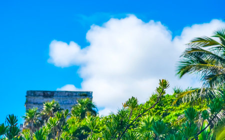 Ancient Tulum ruins Mayan site with temple ruins pyramids and artifacts in the tropical natural jungle palm trees landscape panorama view in Tulum Mexico.