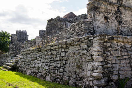 Ruined historic Architecture in the pre Columbian walled city of Tulum, in the Yucutan Peninsula in the state of Quintana Roo, Mexico