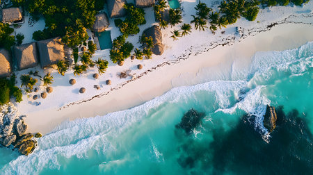 Aerial view of beautiful tropical beach with palm trees and turquoise ocean water