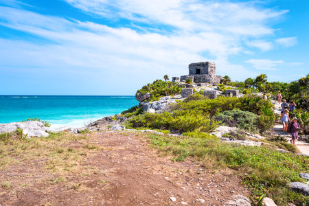 Tulum, Mexico - April 20, 2016: Sea view from the Mayan city archaeological site, with tourists on the right