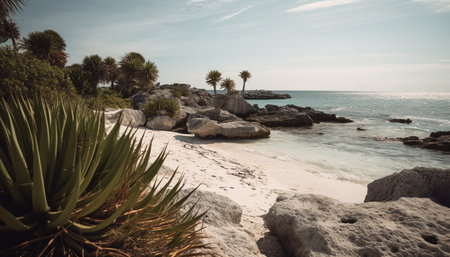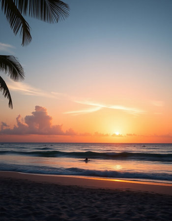 Tranquil sunset over tropical coastline, palm trees sway in breeze generated by artificial intelligence