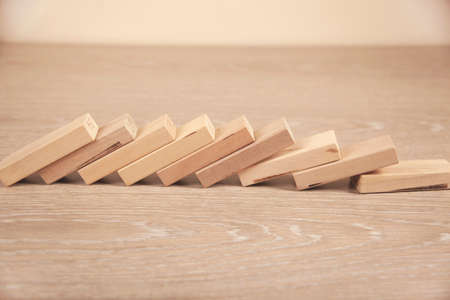 Closeup hand push the wooden domino fall down