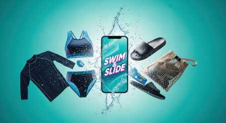 Vibrant smartphone mock up showcases swimwear collection with splashes of water, including swimsuits, sandals, and accessories, perfect for summer online shopping