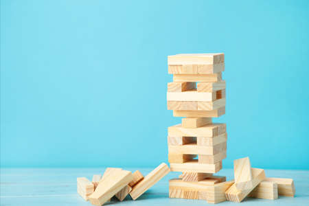 Business risk concept with wood game. Wooden blocks on blue background