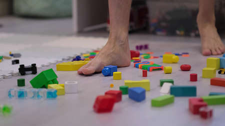 barefoot man walks among the scattered toys. Foot stepping on childrens toys. Scattered toys on the floor. concept of an abundance of toys in the modern world.
